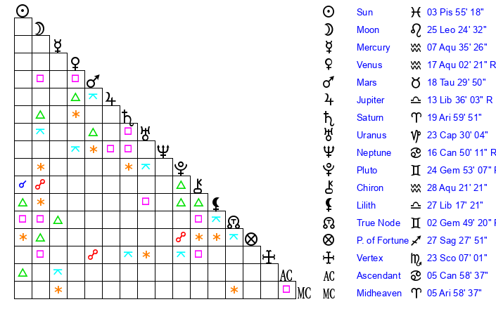 | Sun | 3 Pisces 55 | 5 Pisces 2 | 26 Gemini 16 |
