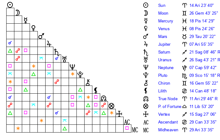 Jupiter | 7 Aries 59 | 16 Gemini 34 | 16 Aries 50 |