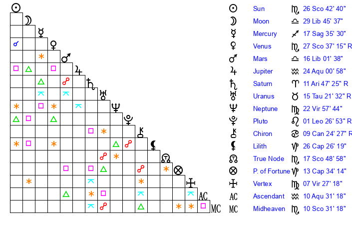 | Sun | 26 Scorpio 42 | 27 Scorpio 37 | 25 Aquarius 7 |