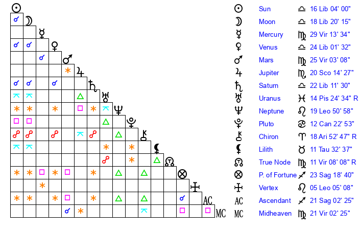 | Sun | 16 Libra 4 | 17 Libra 21 | 29 Capricorn 5 |