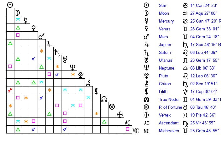 Pluto | 12 Leo 6 | 2 Aquarius 59 | 14 Leo 17 |