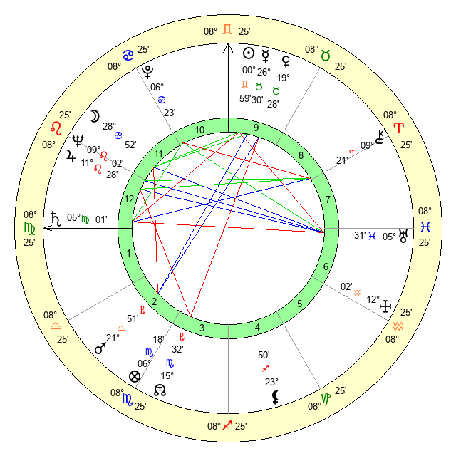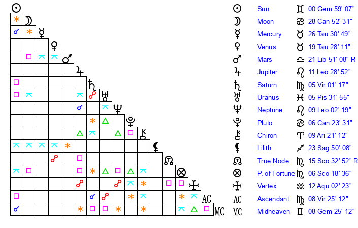 | Sun | 0 Gemini 59 | 1 Gemini 34 | 11 Virgo 32 |
