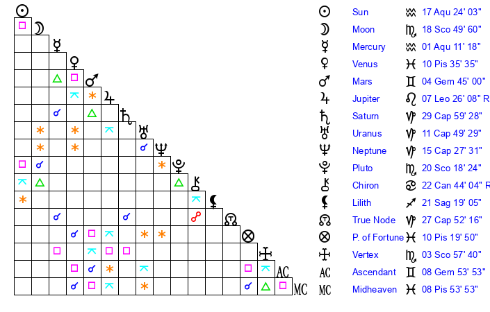 | Moon | 18 Scorpio 50 | 6 Gemini 0 | 8 Aquarius 19 |