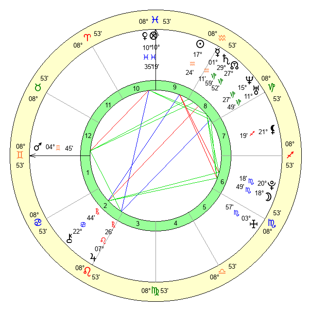 | Mars | 4 Gemini 44 | 18 Cancer 58 | 19 Gemini 9 |