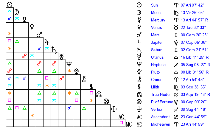 Sun | 7 Aries 7 | 7 Aries 16 | 28 Taurus 47 |