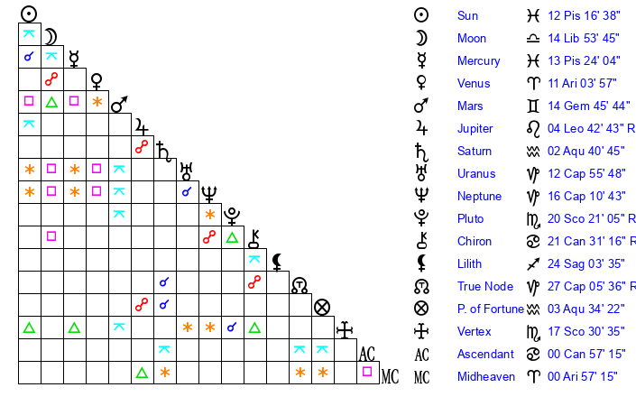 | Sun | 12 Pisces 16 | 13 Pisces 2 | 16 Aries 4 |
