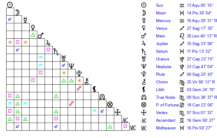 | Sun | 13 Aquarius 5 | 13 Aquarius 48 | 13 Pisces 21 |