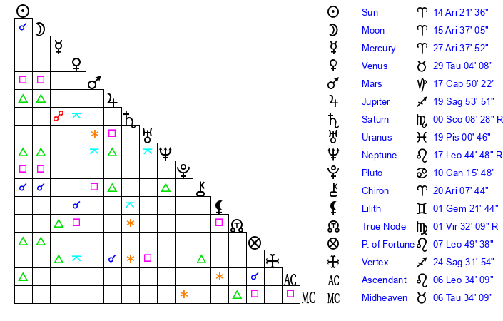 | Moon | 15 Aries 29 | 6 Cancer 27 | 22 Sagittarius 36 |
