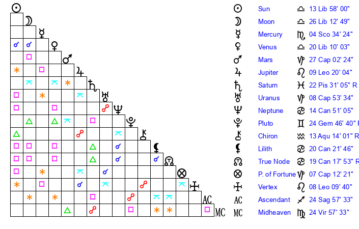 | Moon | 26 Libra 14 | 2 Taurus 48 | 28 Aquarius 12 |