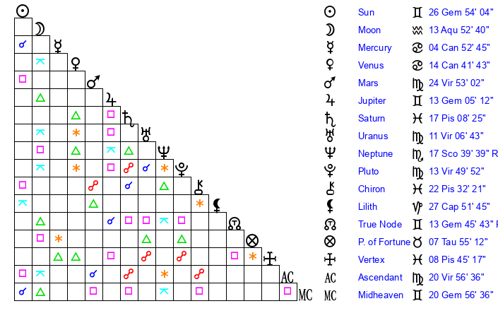 Sun | 26 Gemini 55 | 27 Gemini 23 | 24 Leo 14 |