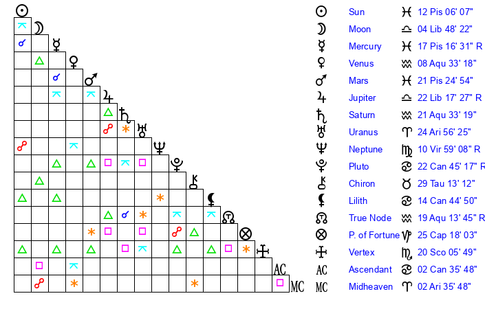 Sun | 12 Pisces 6 | 13 Pisces 2 | 11 Gemini 8 |
