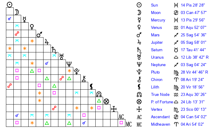 Sun | 14 Pisces 28 | 15 Pisces 22 | 7 Taurus 45 |