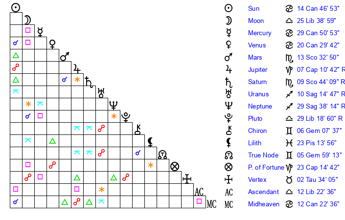 | Moon | 25 Libra 41 | 27 Scorpio 25 | 19 Aries 29 |