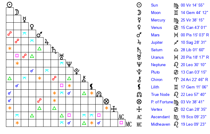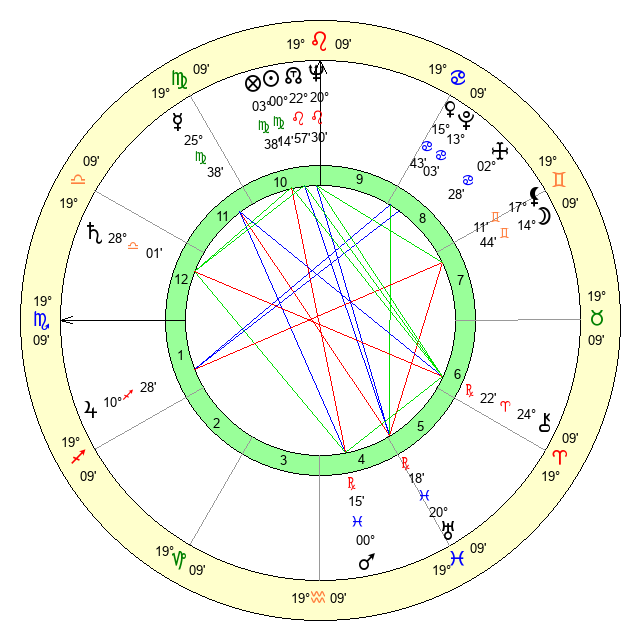 | Mercury | 25 Virgo 38 | 13 Leo 10 | 29 Sagittarius 38 |