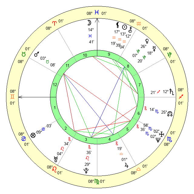 | Moon | 14 Pisces 43 | 9 Aries 57 | 14 Virgo 7 |