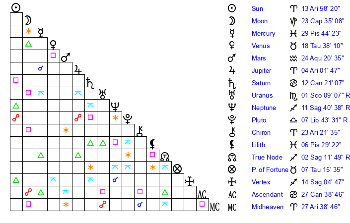 Sun | 13 Aries 58 | 14 Aries 51 | 2 Gemini 35 |
