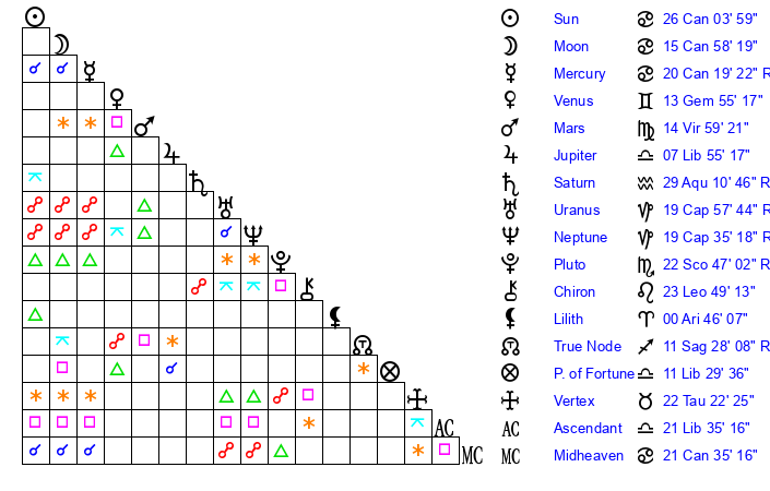 Moon | 16 Cancer 0 | 5 Taurus 14 | 23 Virgo 15 |