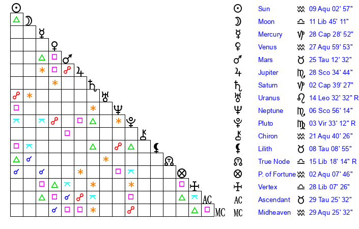 | Moon | 11 Libra 39 | 12 Aquarius 20 | 17 Pisces 50 |