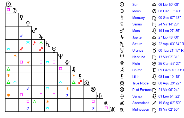 | Saturn | 22 Aquarius 14 | 27 Pisces 40 | 25 Aquarius 1 |