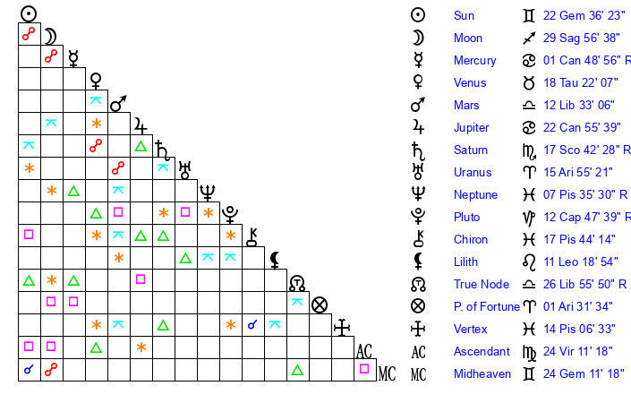 | Sun | 22 Gemini 36 | 22 Gemini 56 | 3 Cancer 6 |