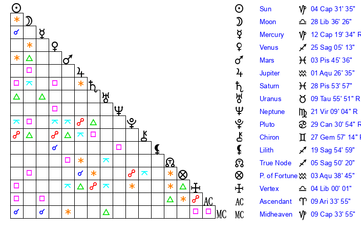 | Moon | 28 Libra 37 | 21 Pisces 40 | 10 Capricorn 23 |