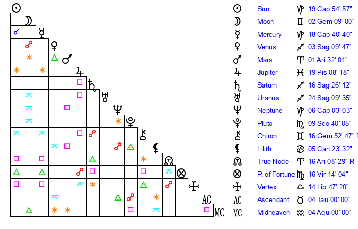 | Sun | 19 Capricorn 55 | 20 Capricorn 28 | 29 Aquarius 30 |