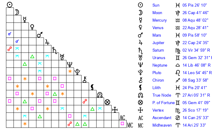 | Sun | 5 Pisces 26 | 6 Pisces 0 | 20 Taurus 20 |