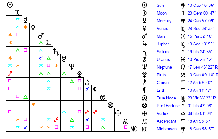 | Neptune | 17 Leo 42 | 27 Pisces 18 | 15 Leo 25 |