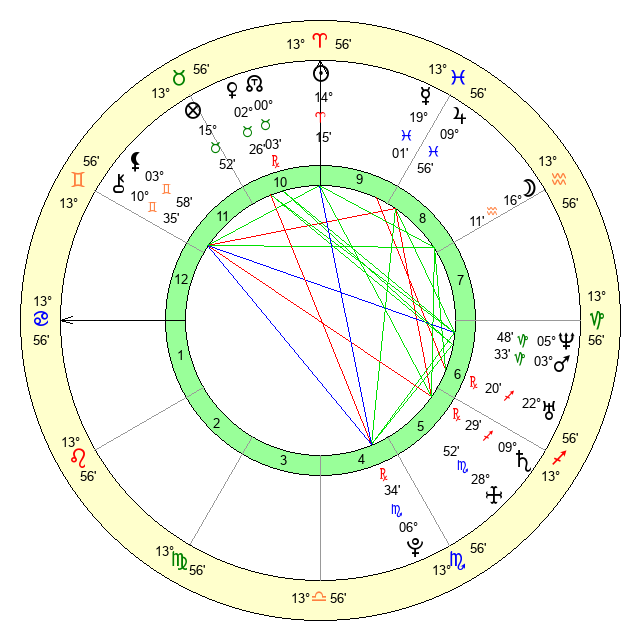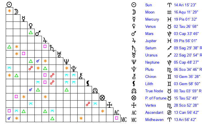 | Moon | 16 Aquarius 10 | 5 Cancer 20 | 10 Cancer 12 |