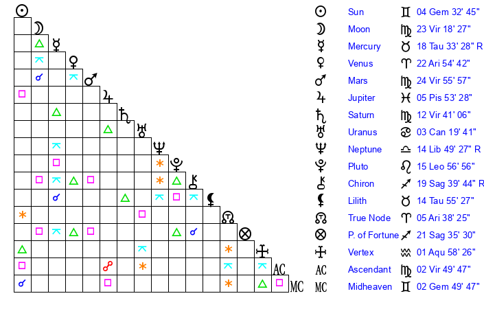 | Sun | 4 Gemini 32 | 5 Gemini 22 | 16 Leo 12 |