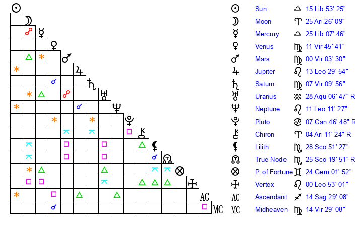 | Saturn | 7 Virgo 49 | 26 Pisces 58 | 11 Virgo 32 |