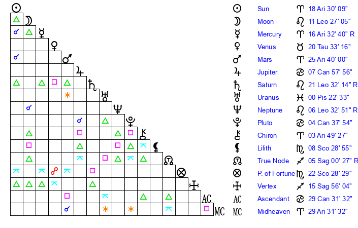 | Sun | 18 Aries 30 | 19 Aries 48 | 0 Leo 26 |