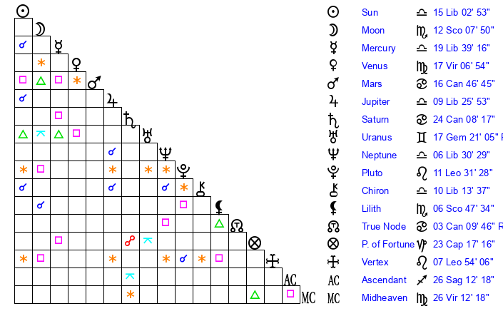 | Sun | 15 Libra 3 | 15 Libra 40 | 5 Capricorn 36 |