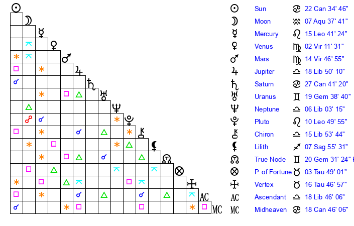 | Sun | 22 Cancer 35 | 23 Cancer 27 | 8 Libra 53 |