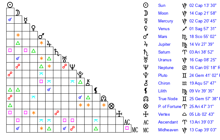 | Moon | 14 Capricorn 18 | 21 Aquarius 59 | 2 Taurus 40 |
