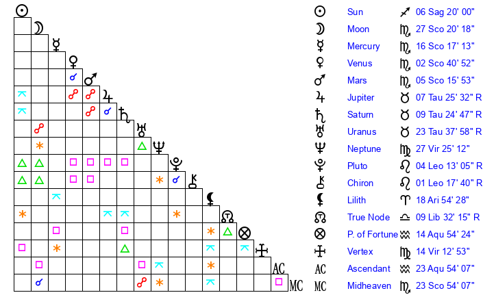| Venus | 2 Scorpio 41 | 27 Scorpio 19 | 18 Aquarius 29 |