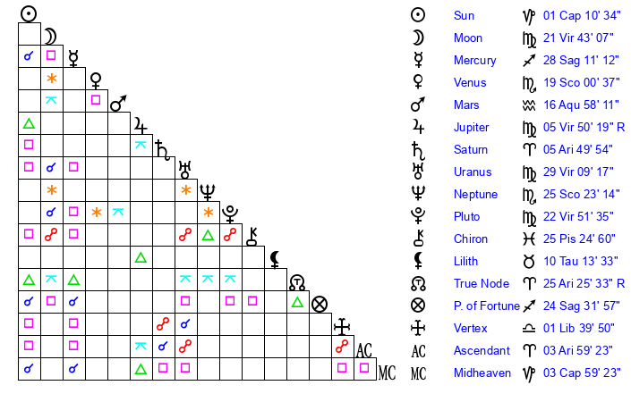 Venus | 19 Scorpio 1 | 18 Aquarius 39 | 28 Capricorn 10 |