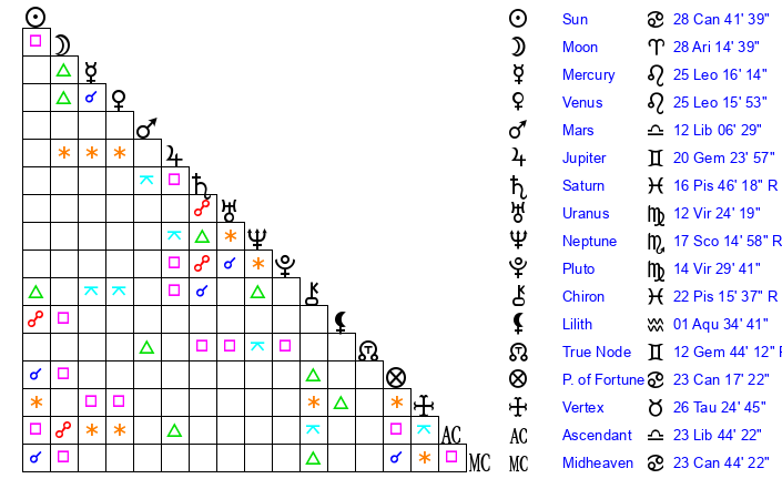 Sun | 28 Cancer 42 | 29 Cancer 11 | 26 Virgo 32 |