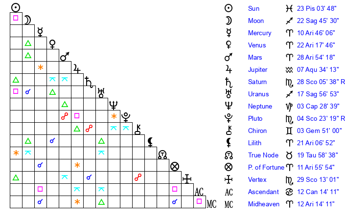 | Saturn | 28 Scorpio 23 | 22 Pisces 11 | 26 Scorpio 47 |