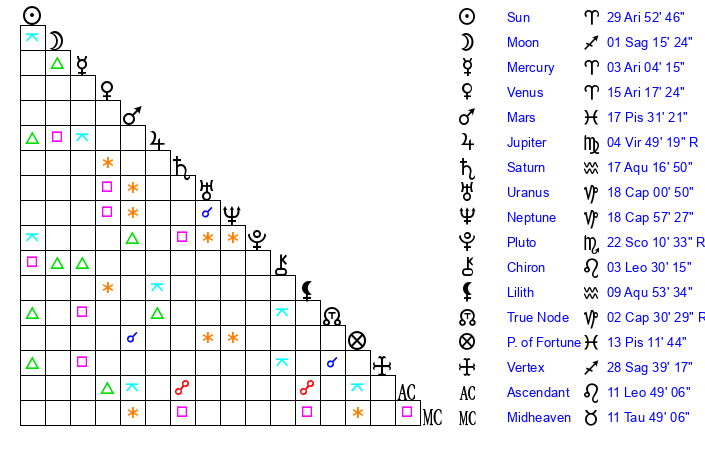 | Saturn | 17 Aquarius 14 | 26 Pisces 34 | 18 Aquarius 24 |