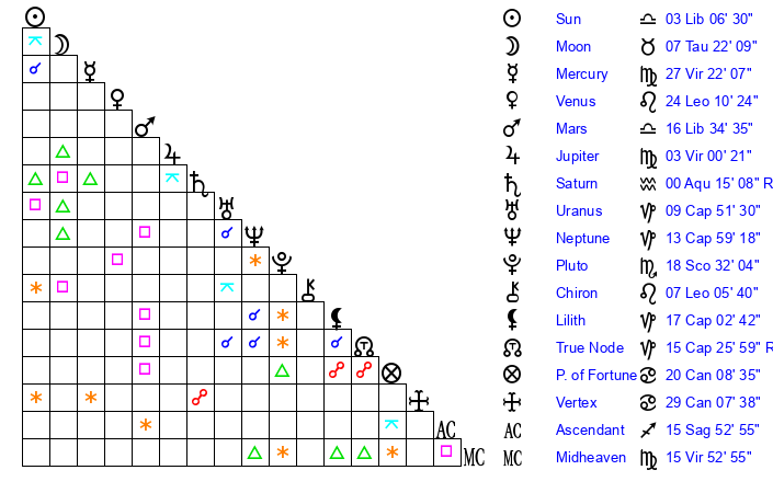 Sun | 3 Libra 6 | 3 Libra 51 | 6 Scorpio 46 |