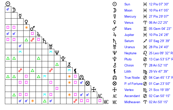 | Sun | 12 Pisces 8 | 13 Pisces 22 | 17 Gemini 51 |