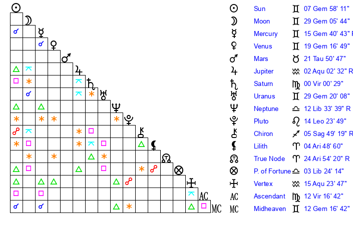 | Mercury | 15 Gemini 41 | 8 Gemini 0 | 7 Virgo 33 |