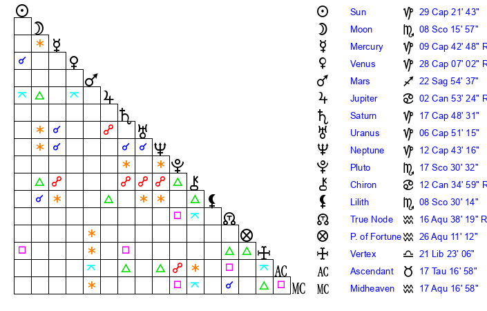Moon | 8 Scorpio 11 | 6 Libra 37 | 13 Aquarius 26 |