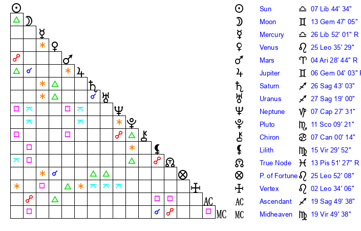 Moon | 13 Gemini 50 | 15 Capricorn 51 | 11 Libra 55 |