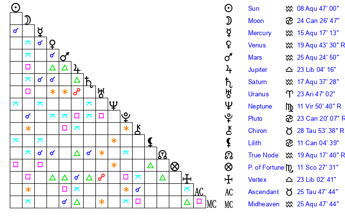 | Venus | 19 Aquarius 43 | 25 Pisces 19 | 23 Pisces 38 |