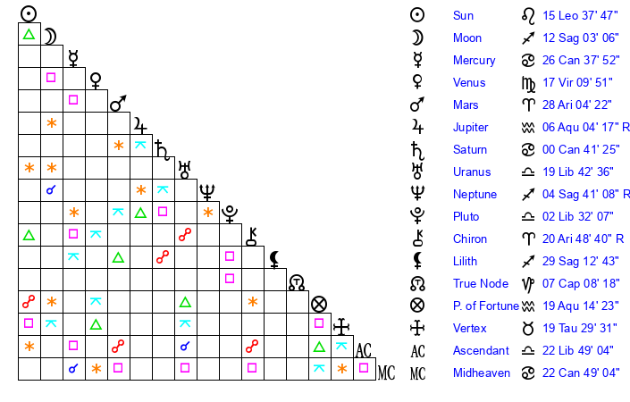 Sun | 15 Leo 37 | 16 Leo 2 | 6 Libra 2 |