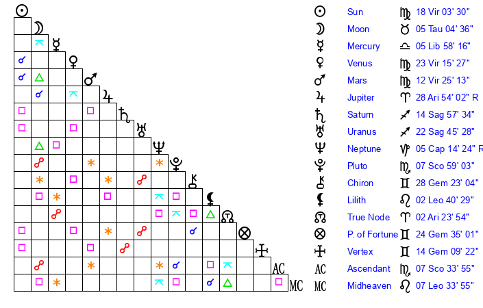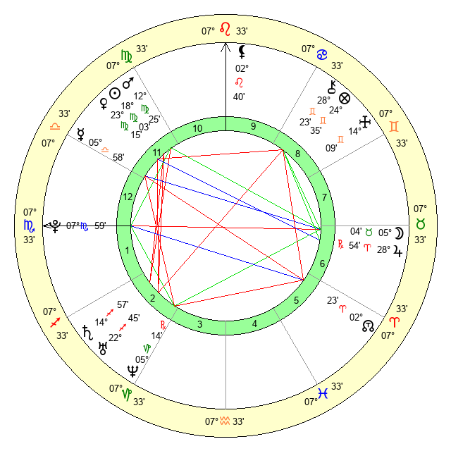 | Venus | 23 Virgo 16 | 20 Leo 2 | 10 Scorpio 33 |