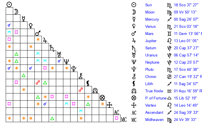 | Sun | 18 Scorpio 37 | 19 Scorpio 8 | 24 Sagittarius 3 |