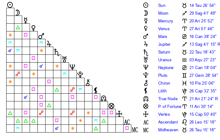 Sun | 14 Taurus 27 | 15 Taurus 5 | 2 Virgo 42 |